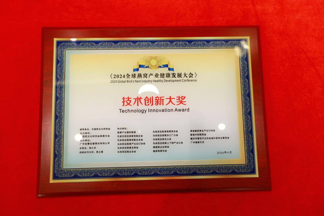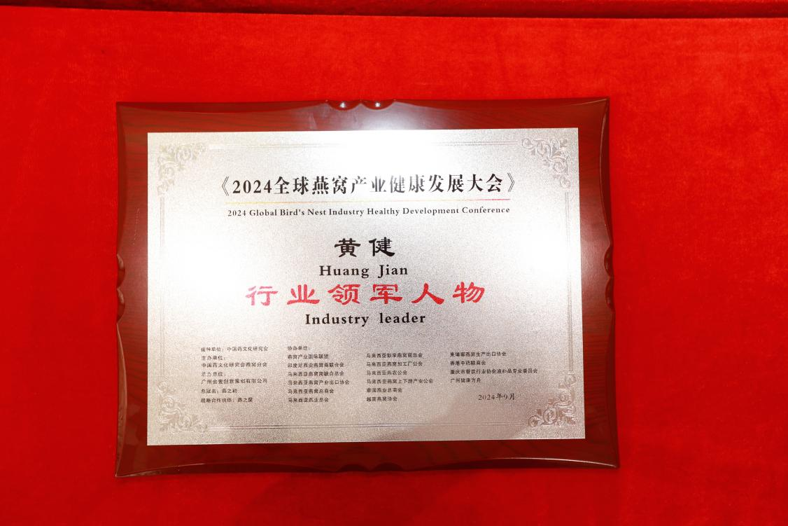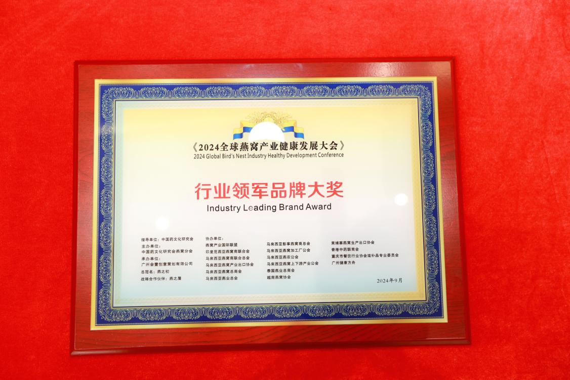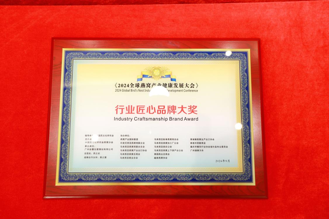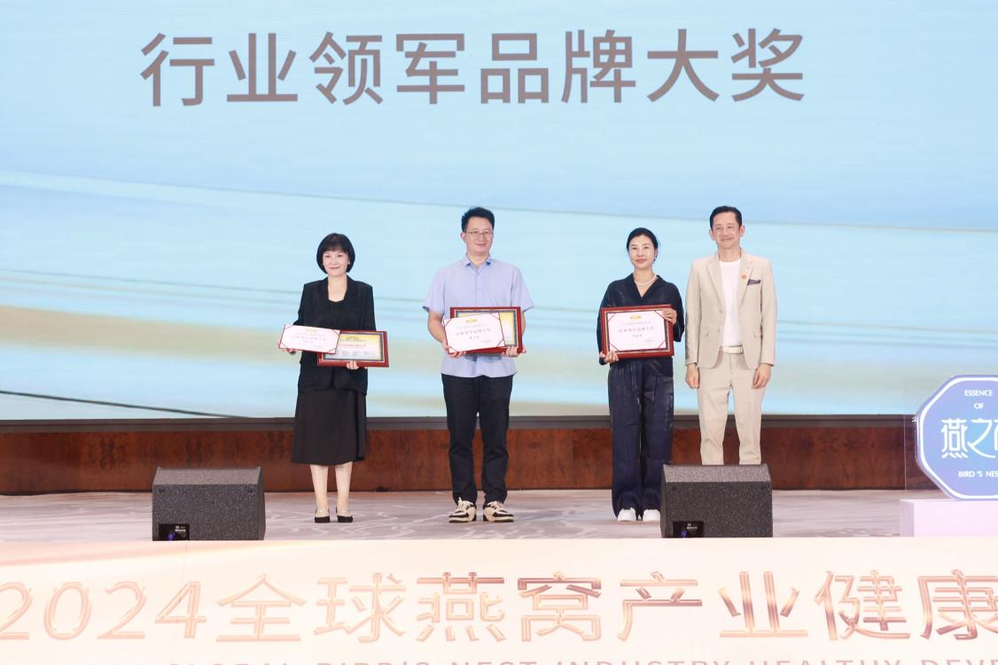 9月23日,在榜樣的力量一行業(yè)表彰盛典上,燕之屋憑借先進的創(chuàng)新引領力、卓越的產品競爭力、強勁的品牌影響力榮獲行業(yè)領軍品牌大獎、行業(yè)匠心品牌大獎、技術創(chuàng)新大獎,燕之屋創(chuàng)始人、執(zhí)行董事兼董事長黃健榮獲行業(yè)領軍人物;燕之屋傾情助力2024全球燕窩產業(yè)健康發(fā)展大會,進一步推動燕窩產業(yè)的創(chuàng)新發(fā)展,促進燕窩文化的傳承與交流,為行業(yè)的繁榮貢獻力量,獲頒《2024全球燕窩產業(yè)健康發(fā)展大會》戰(zhàn)略合作單位,并成為《2024全球燕窩產業(yè)健康發(fā)展大會》唯一指定碗燕即食燕窩品牌,燕之屋公關總監(jiān)楊航上臺領獎。
