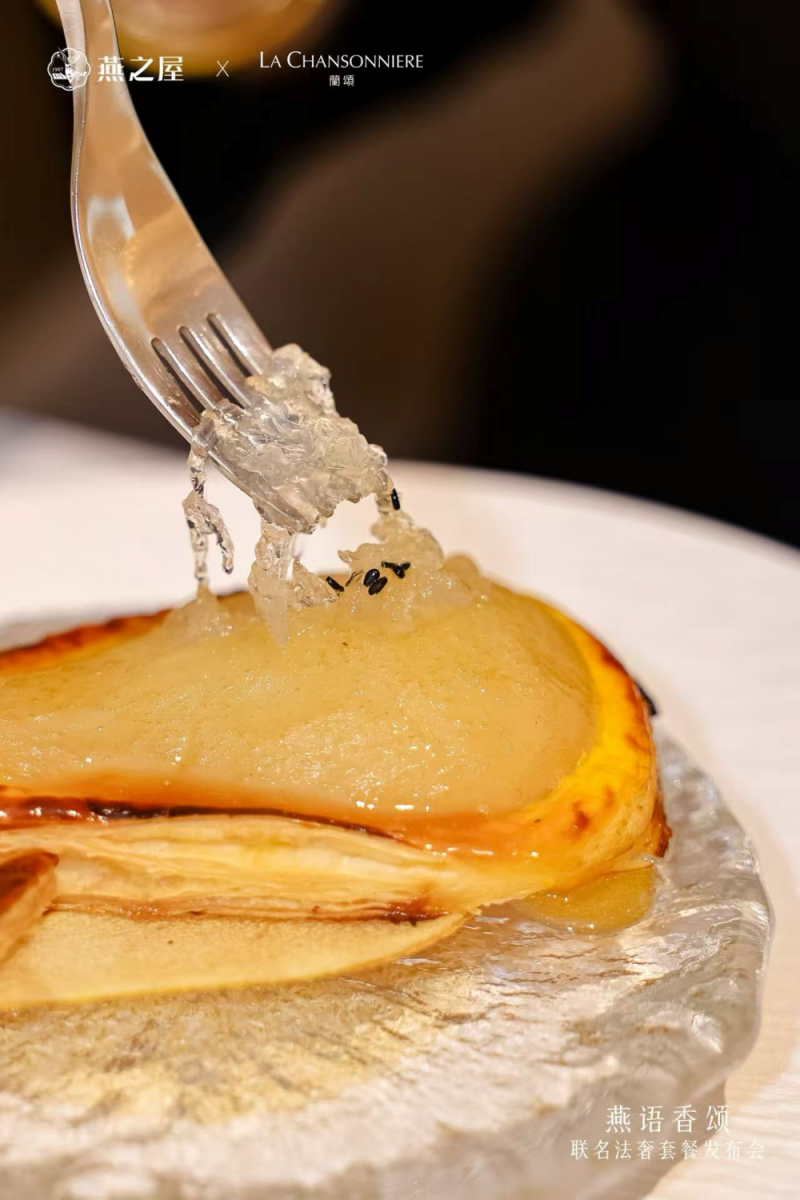 貝貝南瓜配燕之屋燕窩與手作土豆面團(tuán), 是融合了意大利和法式烹飪的傳統(tǒng)歐洲風(fēng)味餐品,由蘭頌生態(tài)農(nóng)場(chǎng)的南瓜和鼠尾草制作的意大利土豆面團(tuán),與燕之屋高品質(zhì)燕窩的創(chuàng)意碰撞,陳年意大利葡萄酒醋點(diǎn)睛,煥新味蕾體驗(yàn);法式傳統(tǒng)酥皮梨與燕之屋燕窩(Poire Belle Hélène), 是誕生于19世紀(jì)末的法國經(jīng)典的甜點(diǎn)之一,當(dāng)絲絲晶瑩剔透的燕窩與法式燉梨巧妙結(jié)合,清雅柔滑,相得益彰,滋補(bǔ)與甜美雙重升華。